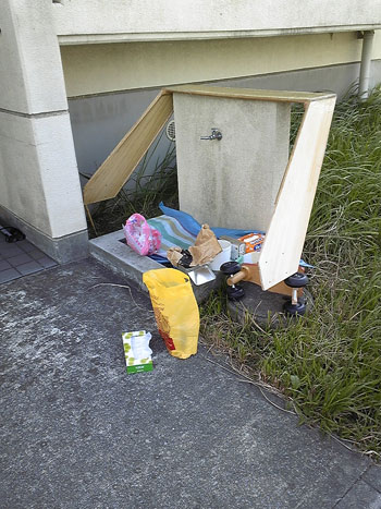 ![]() | 僕は団地住まいなので、階段下の共用水道のスペースで板の上にFRPをペタペタします。じつに近所迷惑です(^^; |