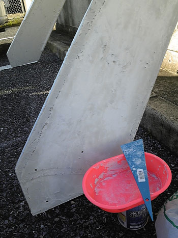 ![]() | FRP作業の後に色を塗ってみたところ、FRPのデコボコが目立ってしまったので、パテを盛って平らにしました。 |