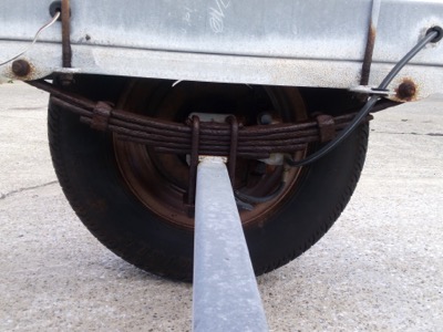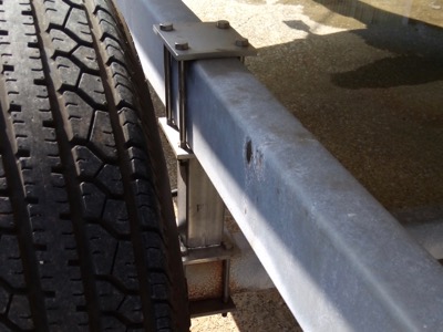 置場の敷地内で動かすだけで、道路には出ません。サスペンション機能は不要と思いましたので、板バネは取り払いステンレスの金物で連結しました。